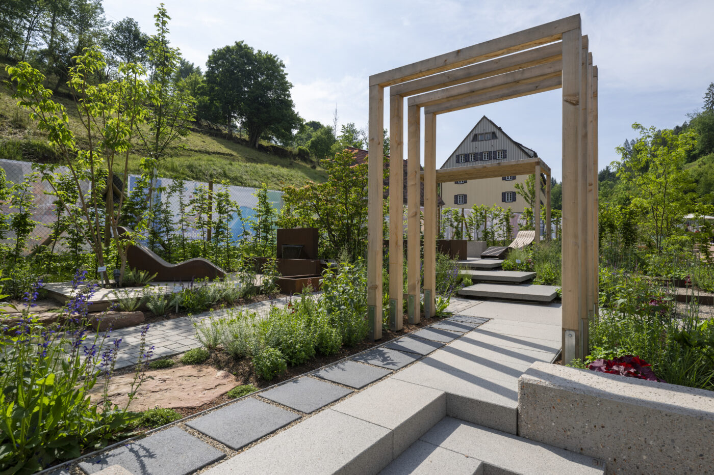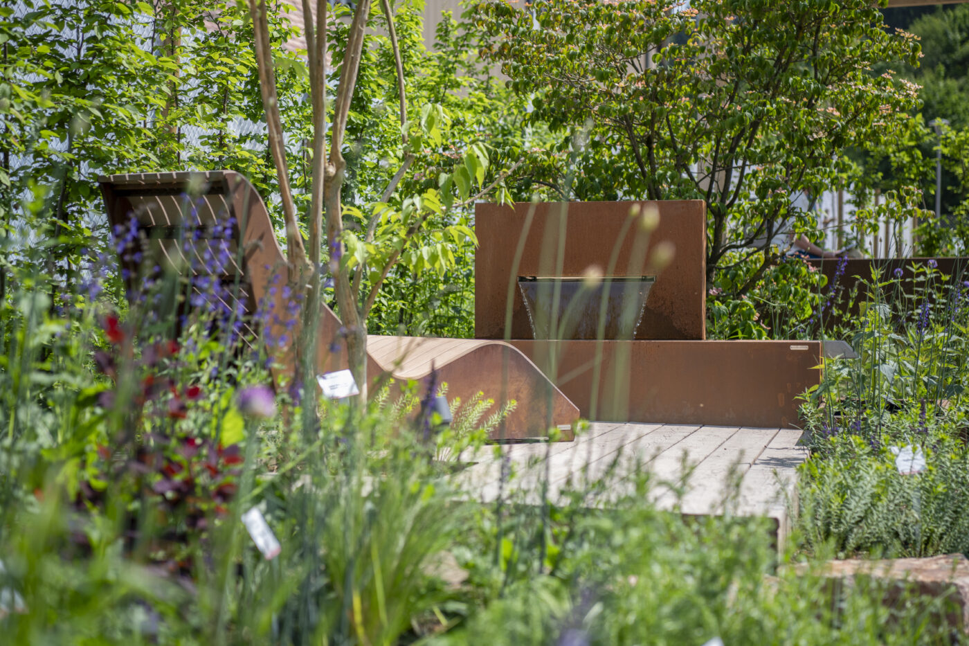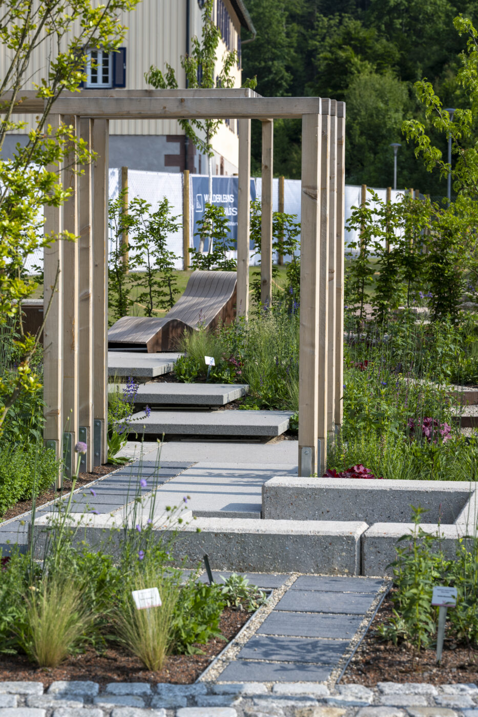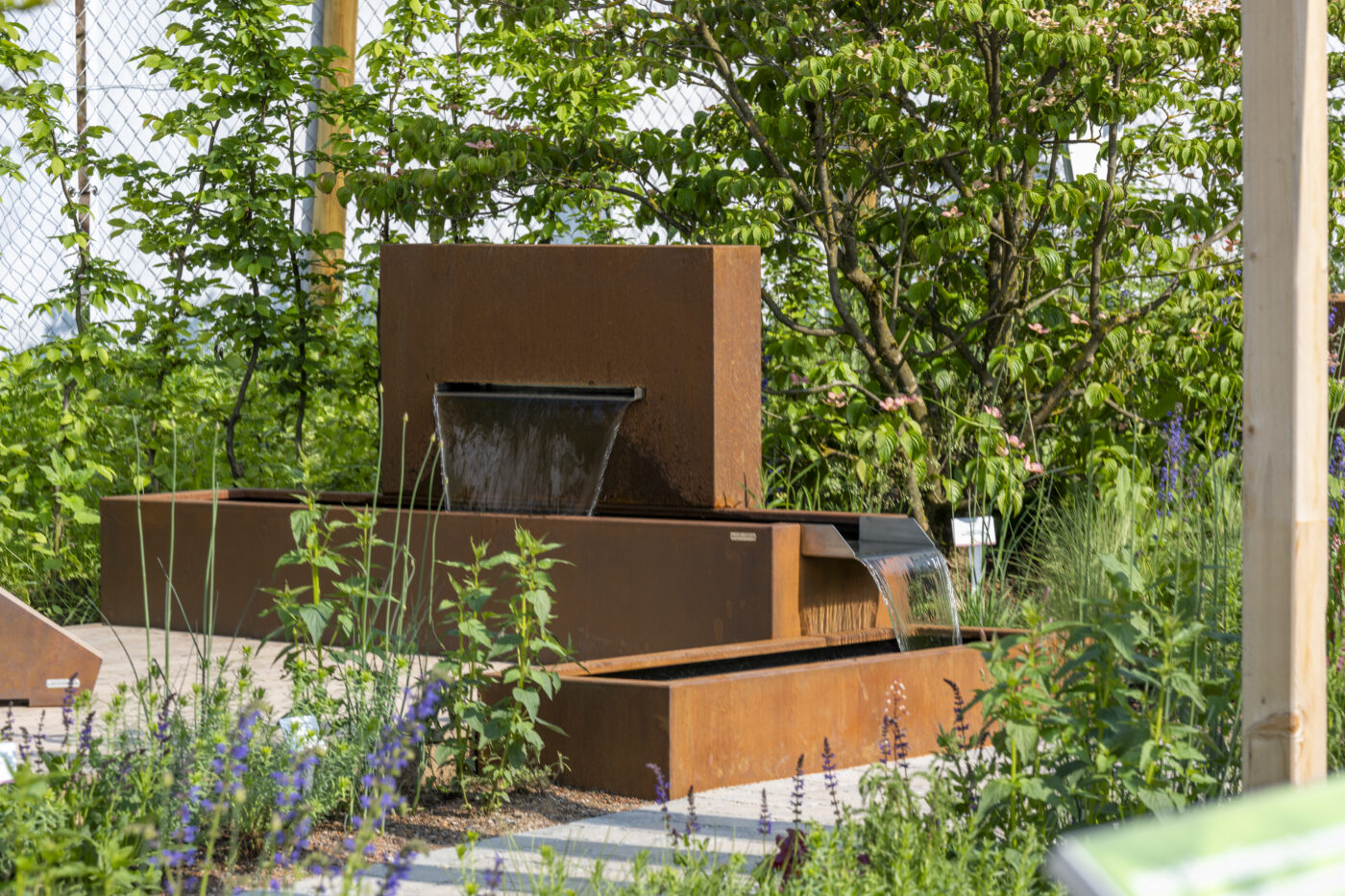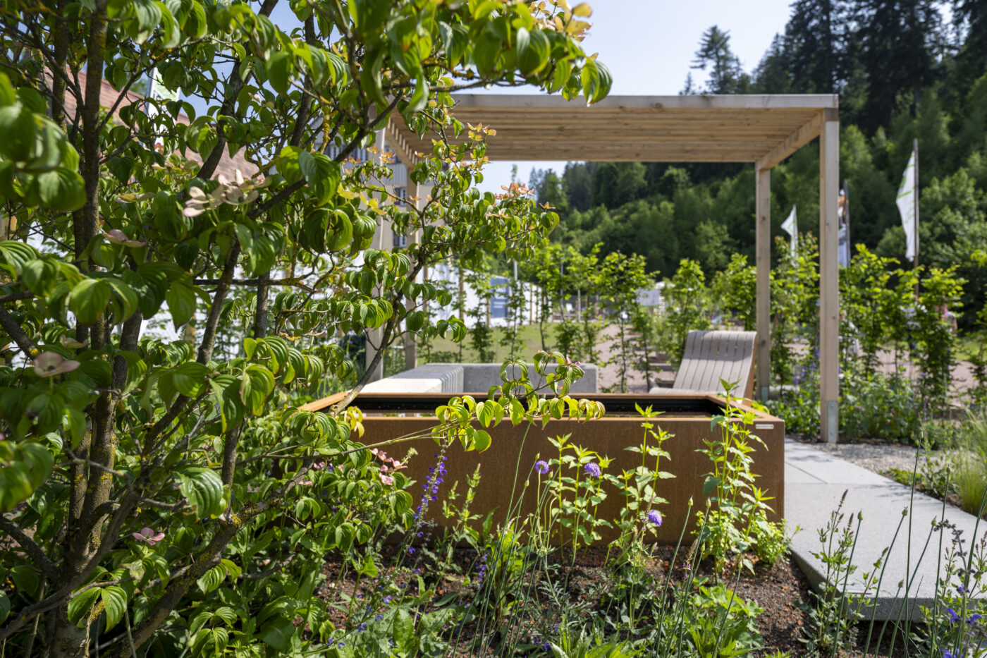 Der Entwurf vereint den modernen Charme von Beton und Cortenstahl mit ursprünglichen Elementen wie Sandstein, Holz und naturnaher Bepflanzung. Interessante Sitzgelegenheiten aus recyceltem Beton laden zum Innehalten im Senkgarten und an der Freiterrasse ein.