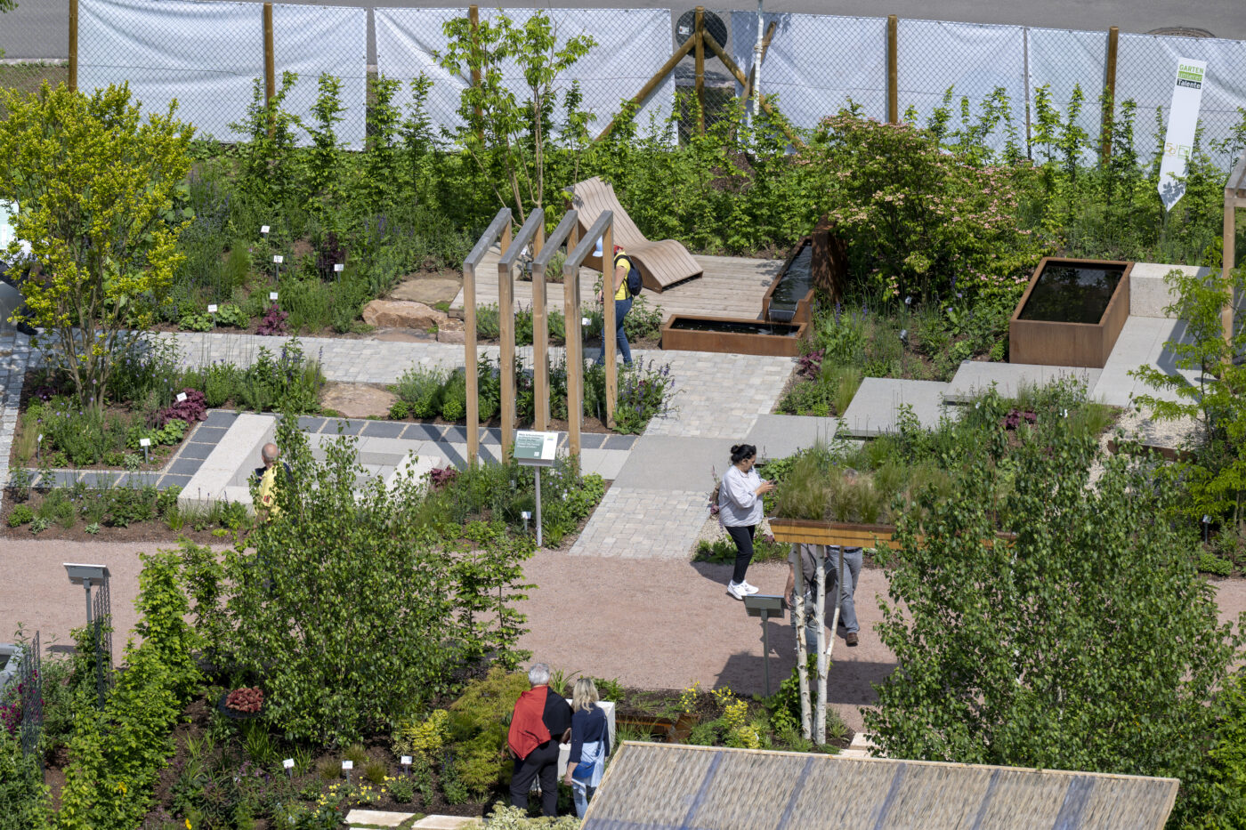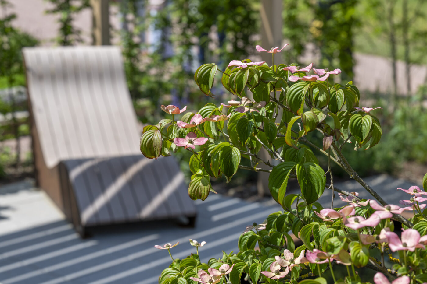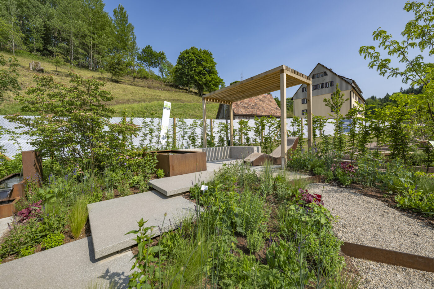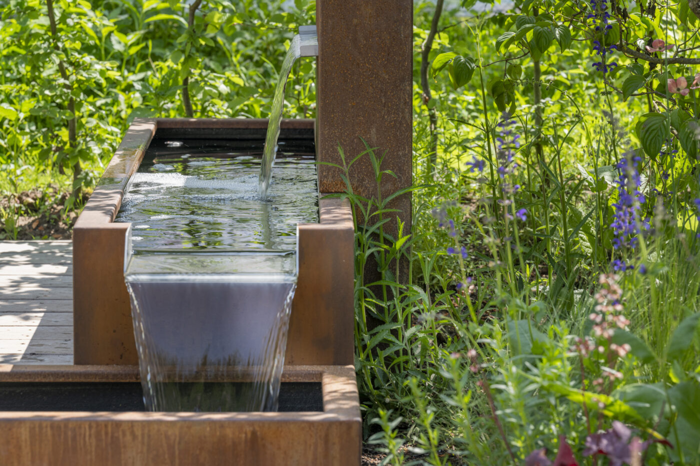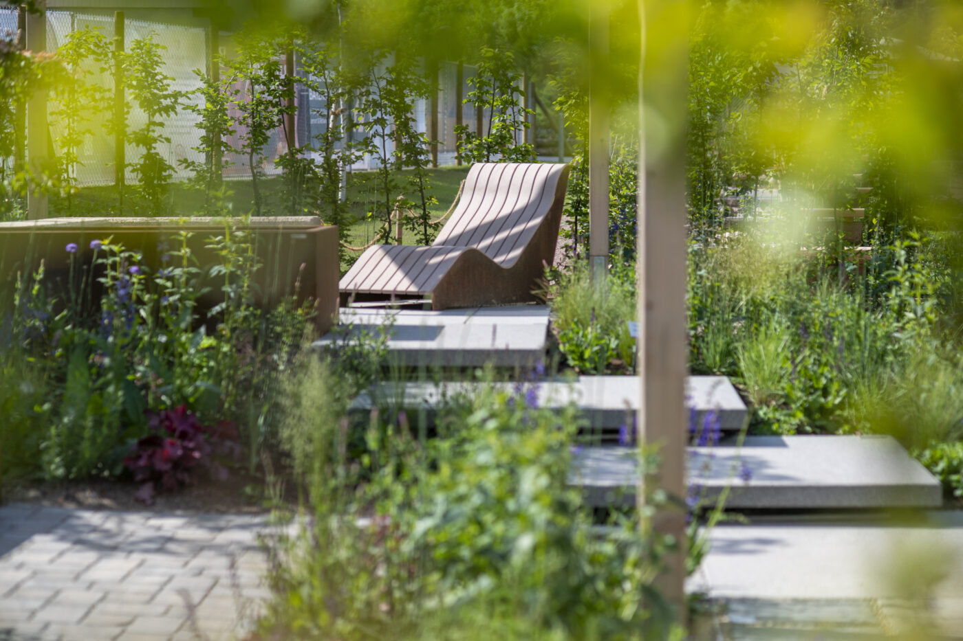 Der Entwurf vereint den modernen Charme von Beton und Cortenstahl mit ursprünglichen Elementen wie Sandstein, Holz und naturnaher Bepflanzung. Interessante Sitzgelegenheiten aus recyceltem Beton laden zum Innehalten im Senkgarten und an der Freiterrasse ein.