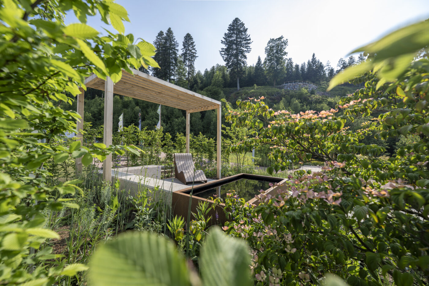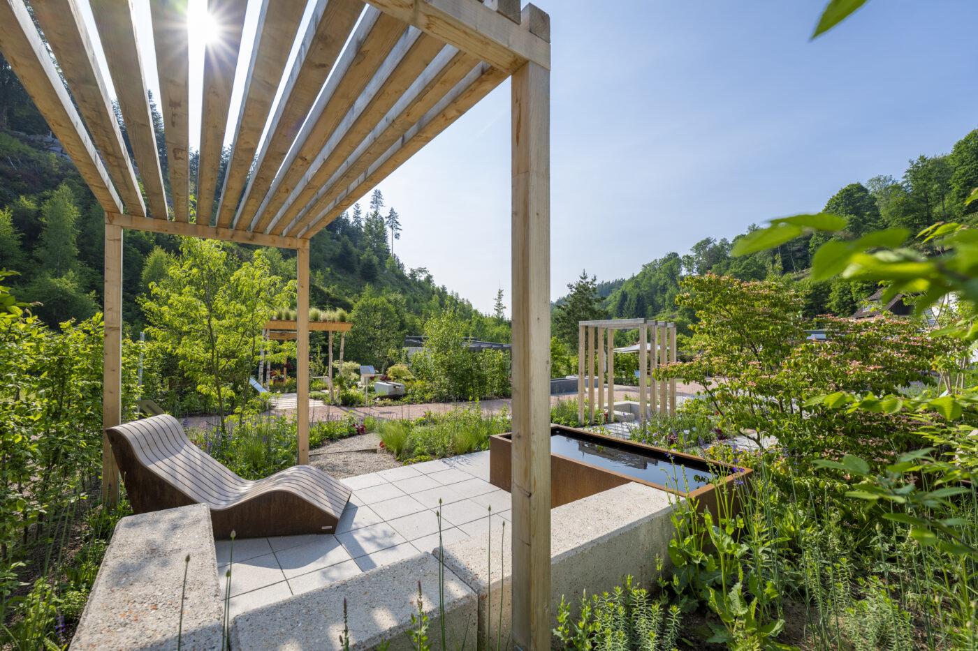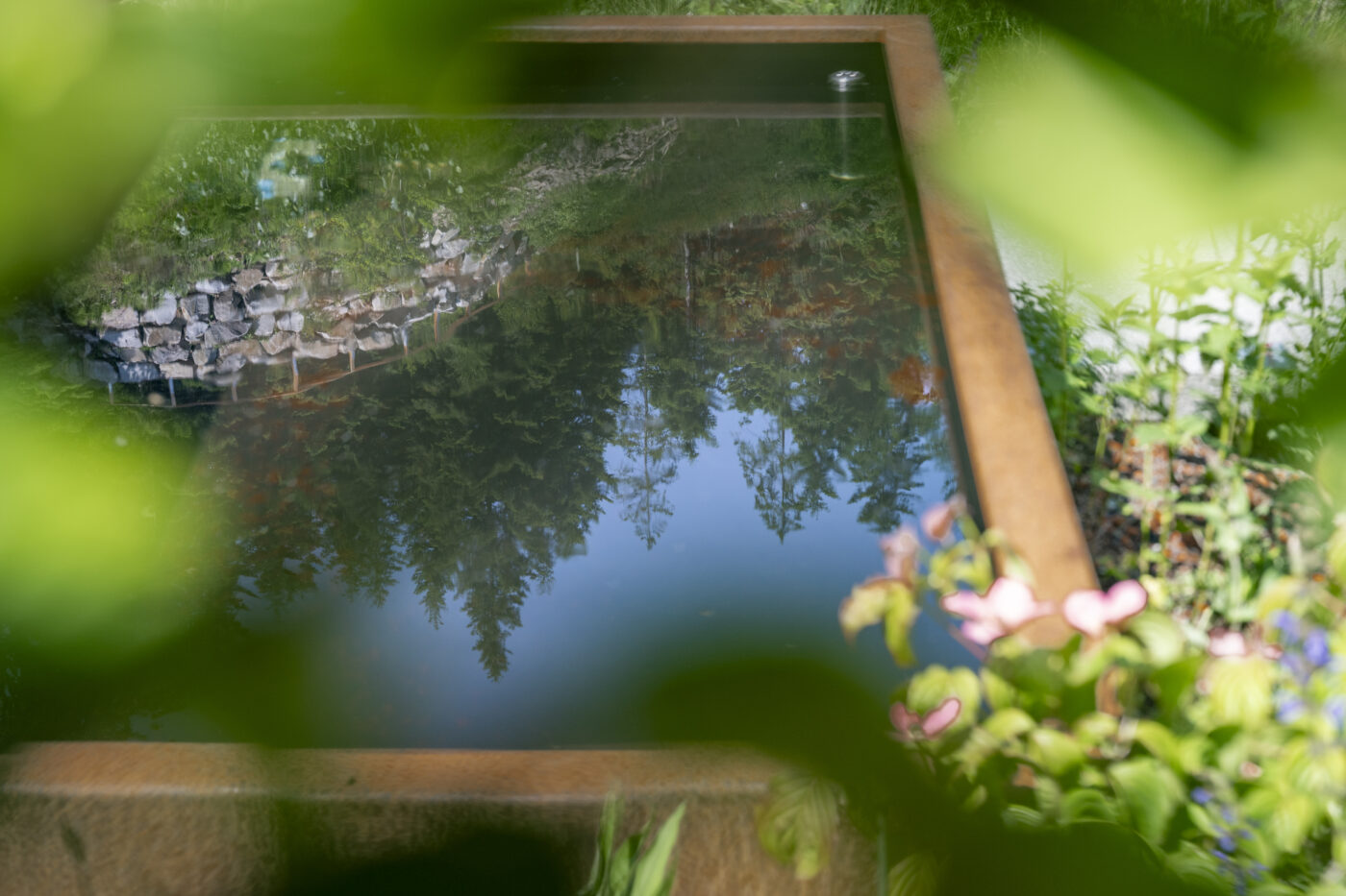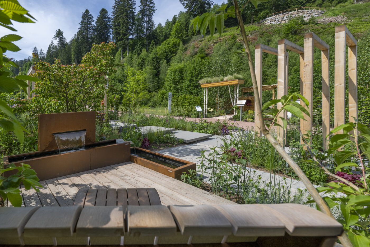 Schwebestufen sowie Pfade führen mitten durch die vielseitige Bepflanzung und eröffnen unterschiedlichste Perspektiven purer Lebendigkeit. Charakteristische Sträucher mit prächtigen Blüten und auffälligen Blattstrukturen setzen bewusst Akzente und laden dazu ein, die Vielseitigkeit bis ins Detail zu entdecken. Stille Wasserflächen, aber auch ein sanftes Fließen strahlen Ruhe und Gelassenheit aus.