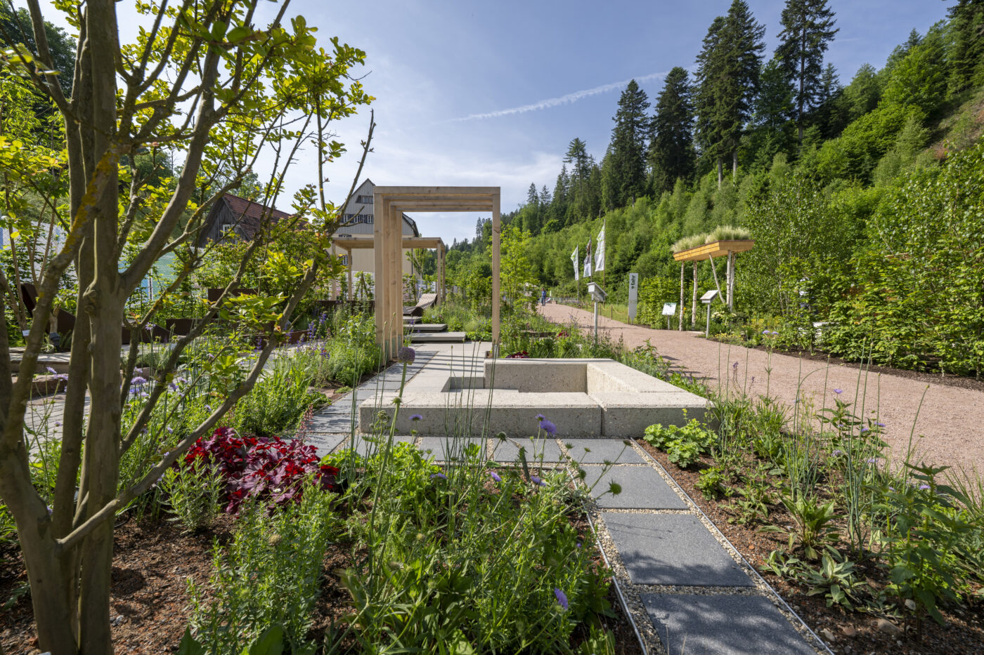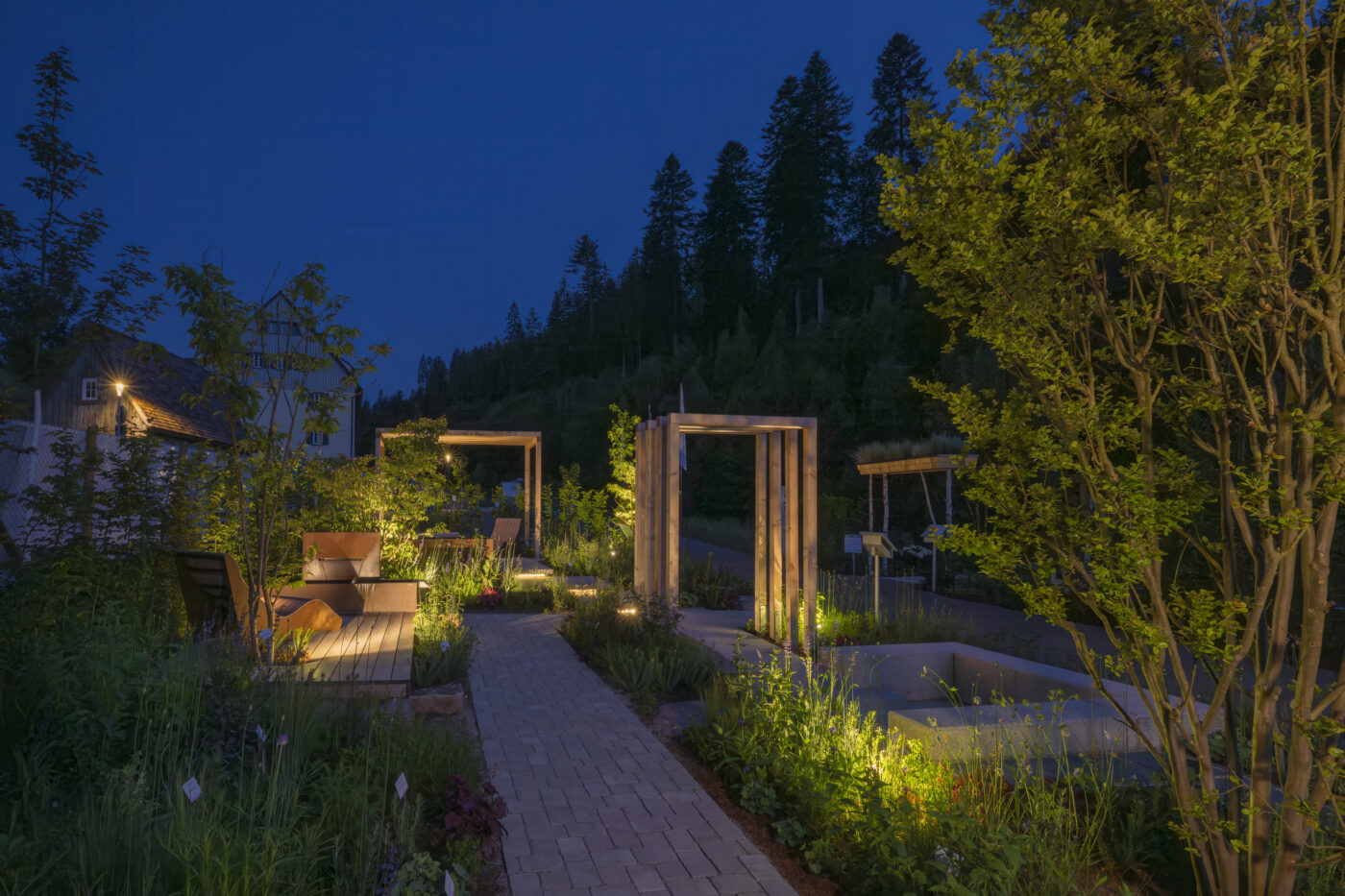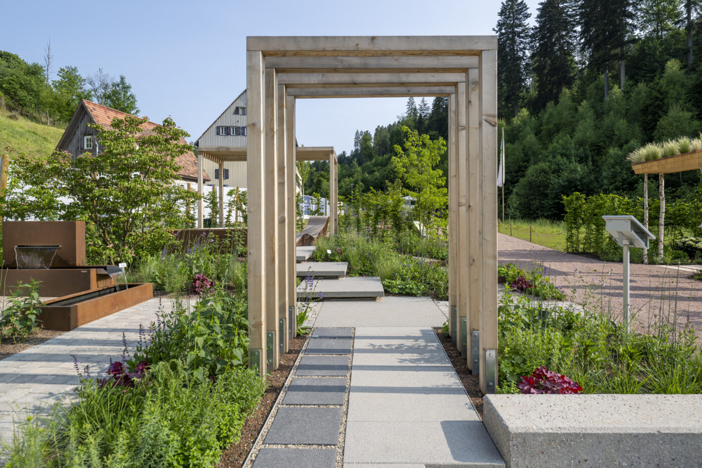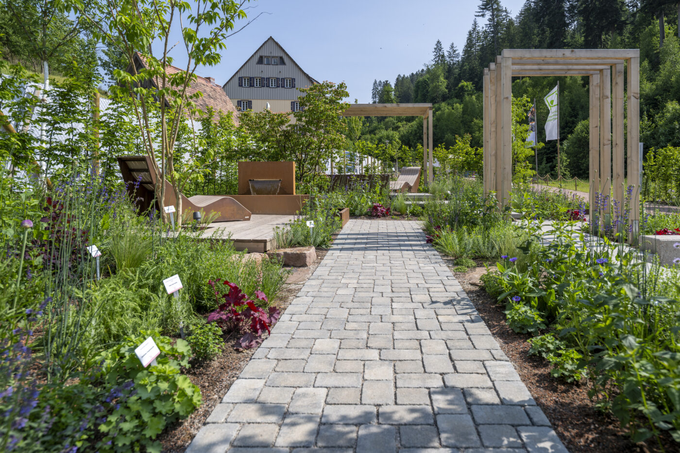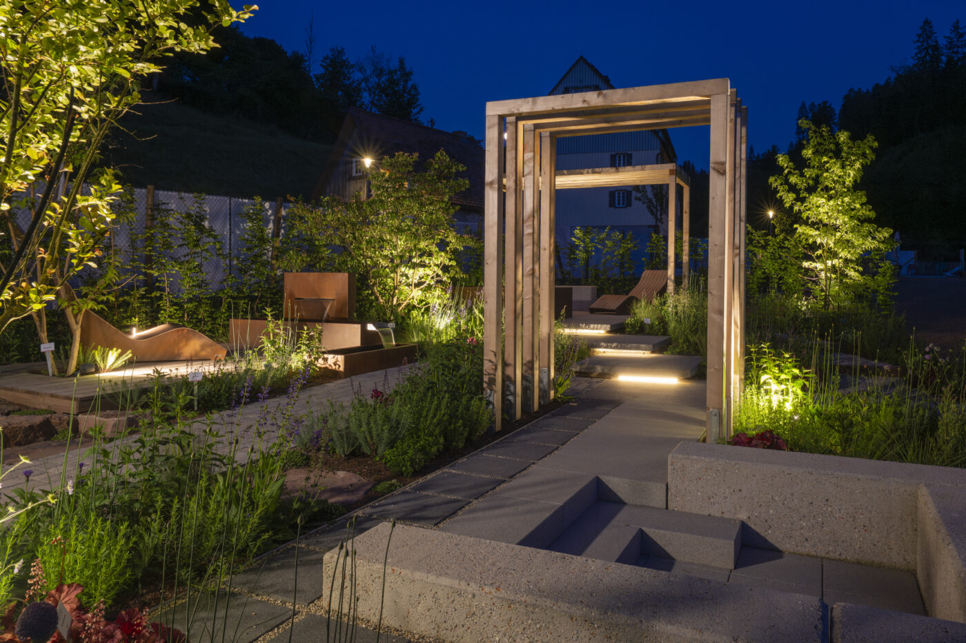 Schwebestufen sowie Pfade führen mitten durch die vielseitige Bepflanzung und eröffnen unterschiedlichste Perspektiven purer Lebendigkeit. Charakteristische Sträucher mit prächtigen Blüten und auffälligen Blattstrukturen setzen bewusst Akzente und laden dazu ein, die Vielseitigkeit bis ins Detail zu entdecken. Stille Wasserflächen, aber auch ein sanftes Fließen strahlen Ruhe und Gelassenheit aus.