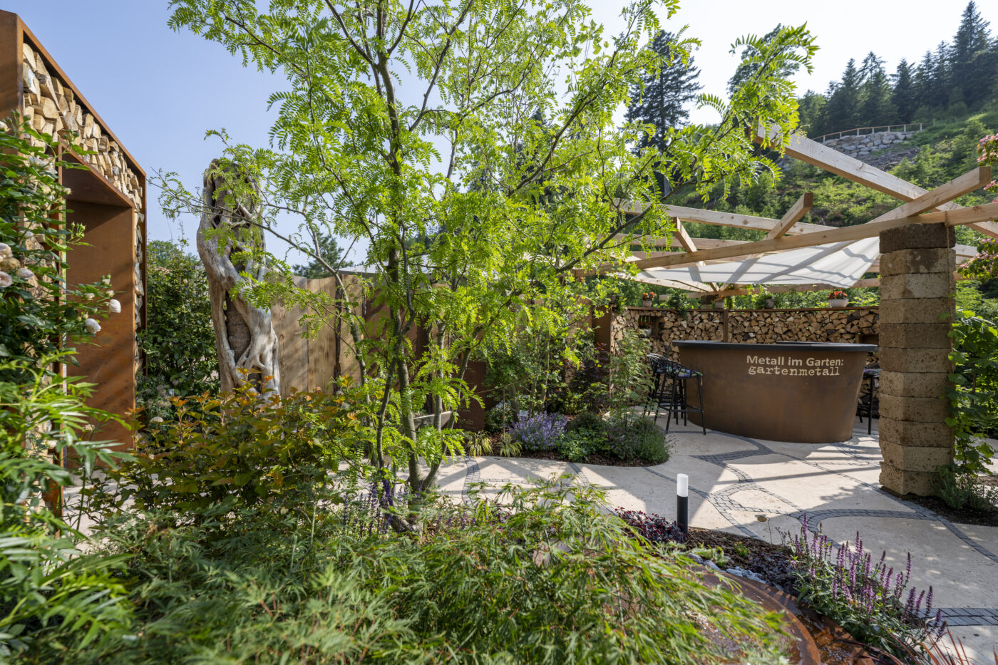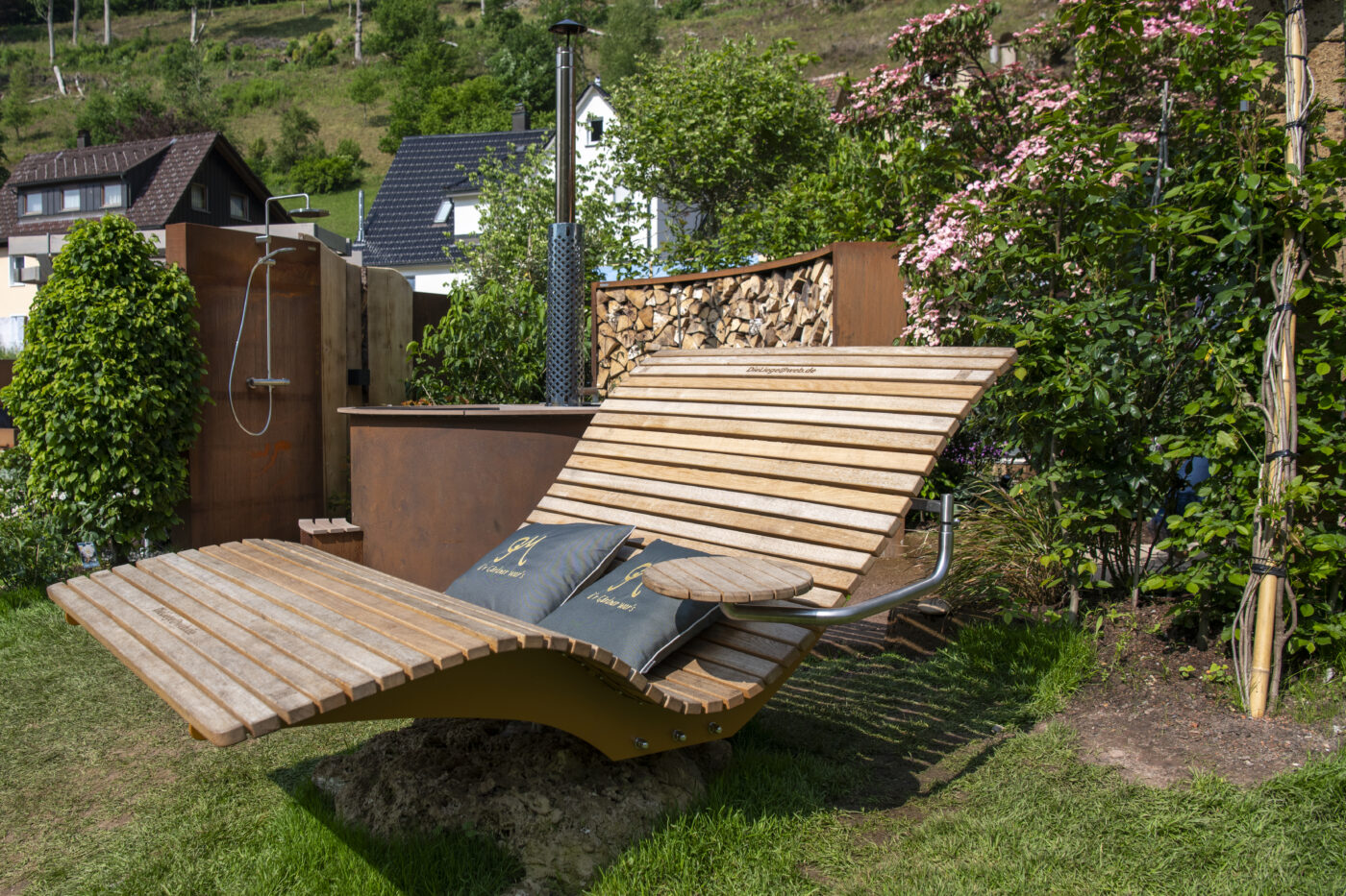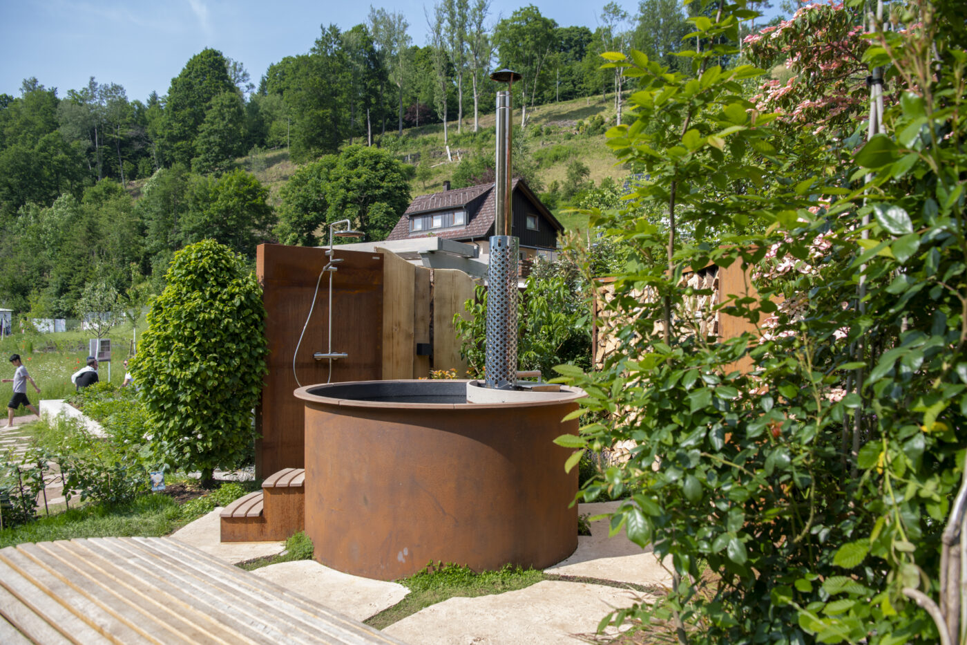 Im Herzen des Gartens steht ein Badefass und bietet atemberaubende Blicke auf Forbach und Schwarzwald. Sichtschutz aus Stahl und Rundholz, Materialien, die seit Jahrhunderten das Christophstal prägen, sorgen für geschützte Entspannung.