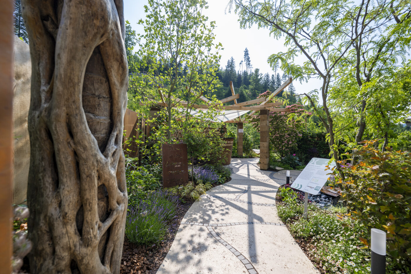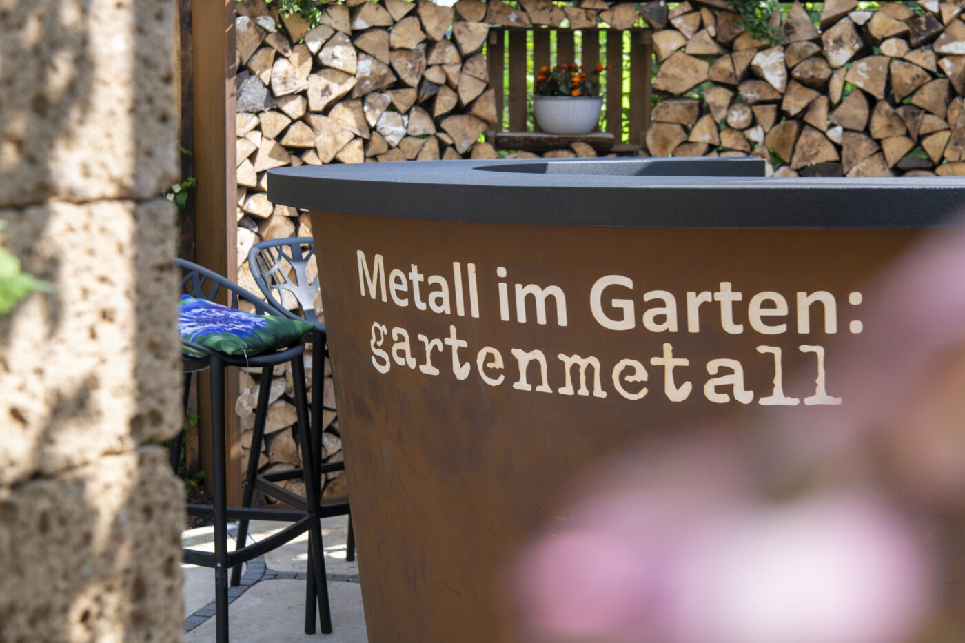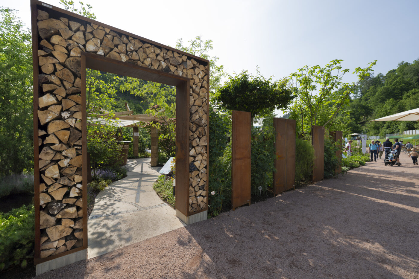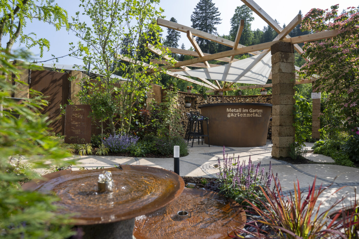 Im Herzen des Gartens steht ein Badefass und bietet atemberaubende Blicke auf Forbach und Schwarzwald. Sichtschutz aus Stahl und Rundholz, Materialien, die seit Jahrhunderten das Christophstal prägen, sorgen für geschützte Entspannung.