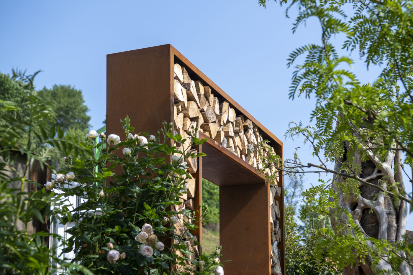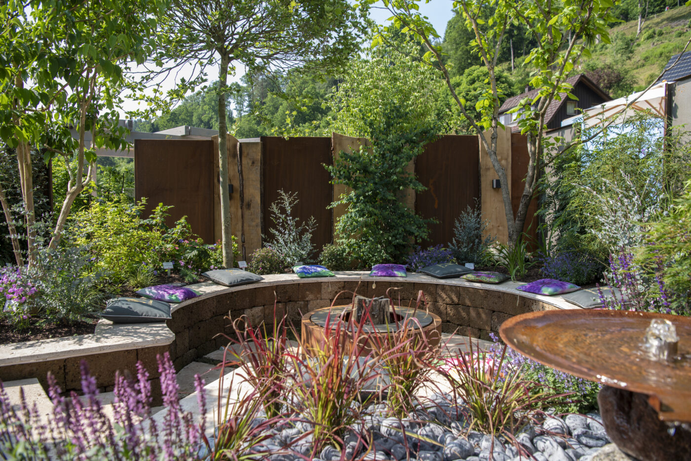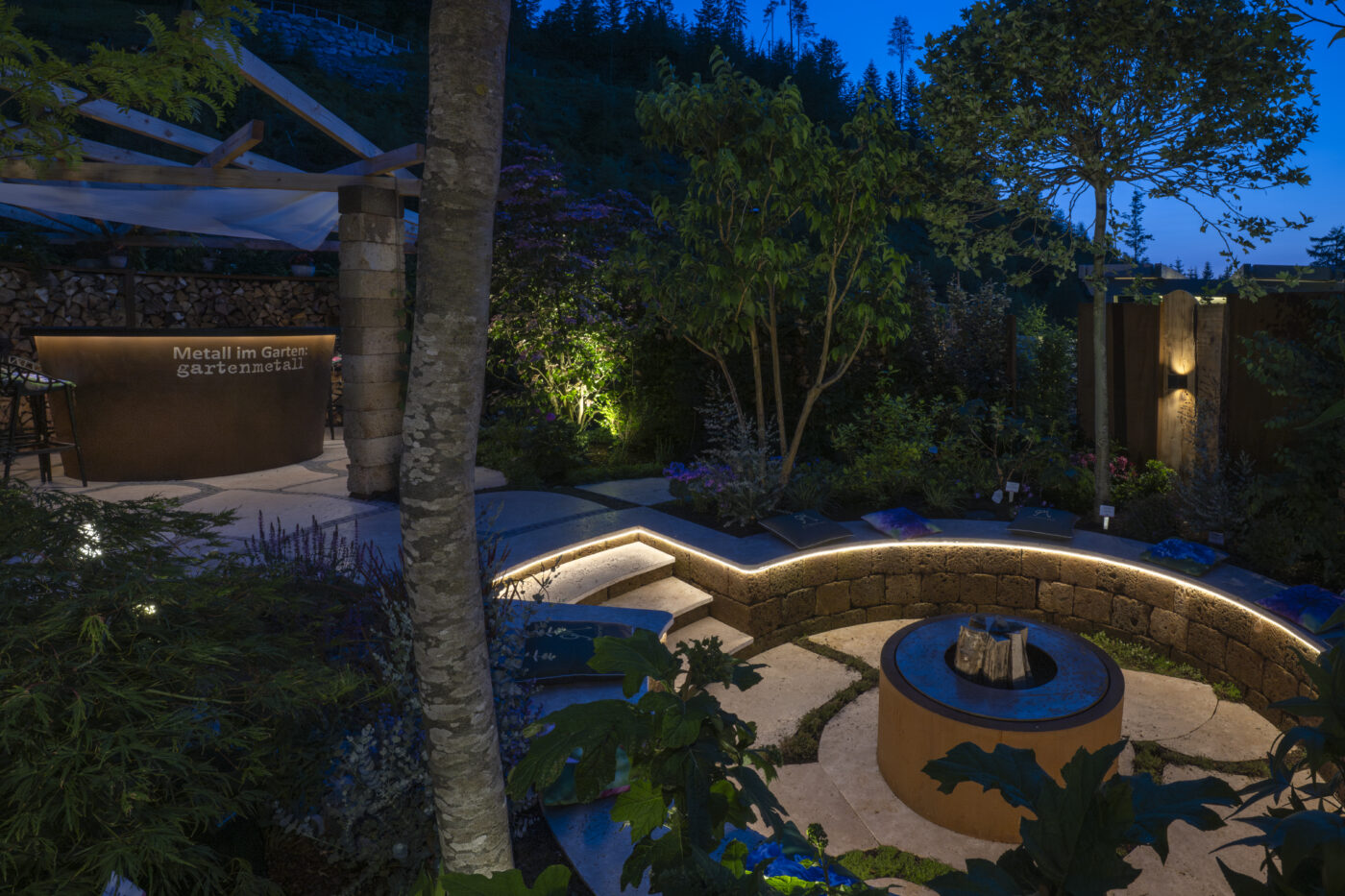 Bereits der Blick durch das beeindruckende Tor lässt die Schönheit und Ruhe dieses Ortes erahnen: Eine Oase, in der Platten aus Travertin den Weg ebnen und Teppichthymian die Schritte umschmeichelt. Der tieferliegende Grillplatz ist der Wohlfühlort für gesellige Abende. Tuffsteinmauern, Kleinsteinpflaster und duftende Kräuter vervollkommnen die Atmosphäre und unter der mit Hopfen berankten Pergola verspricht eine Bar entspannte Stunden.
