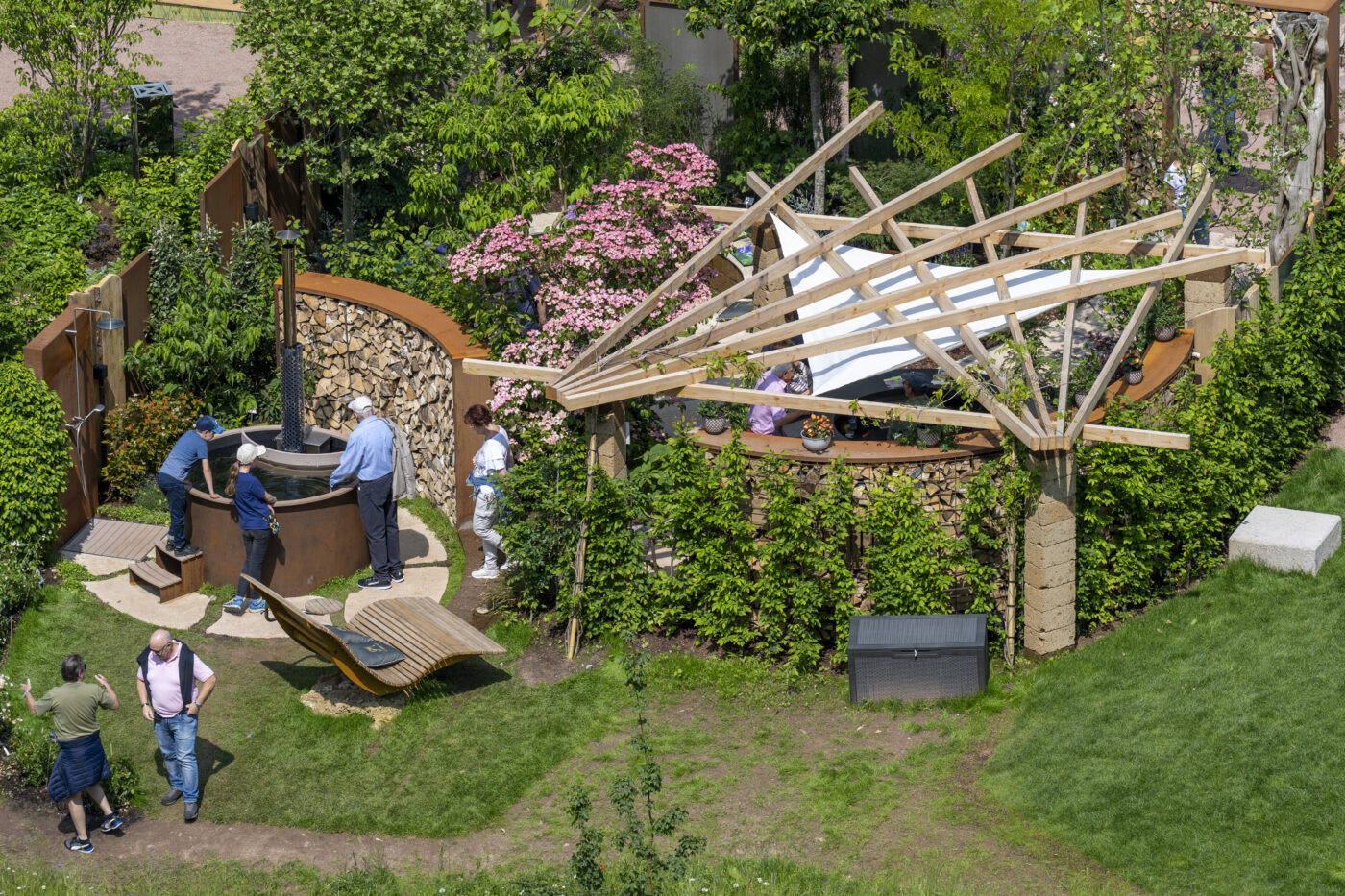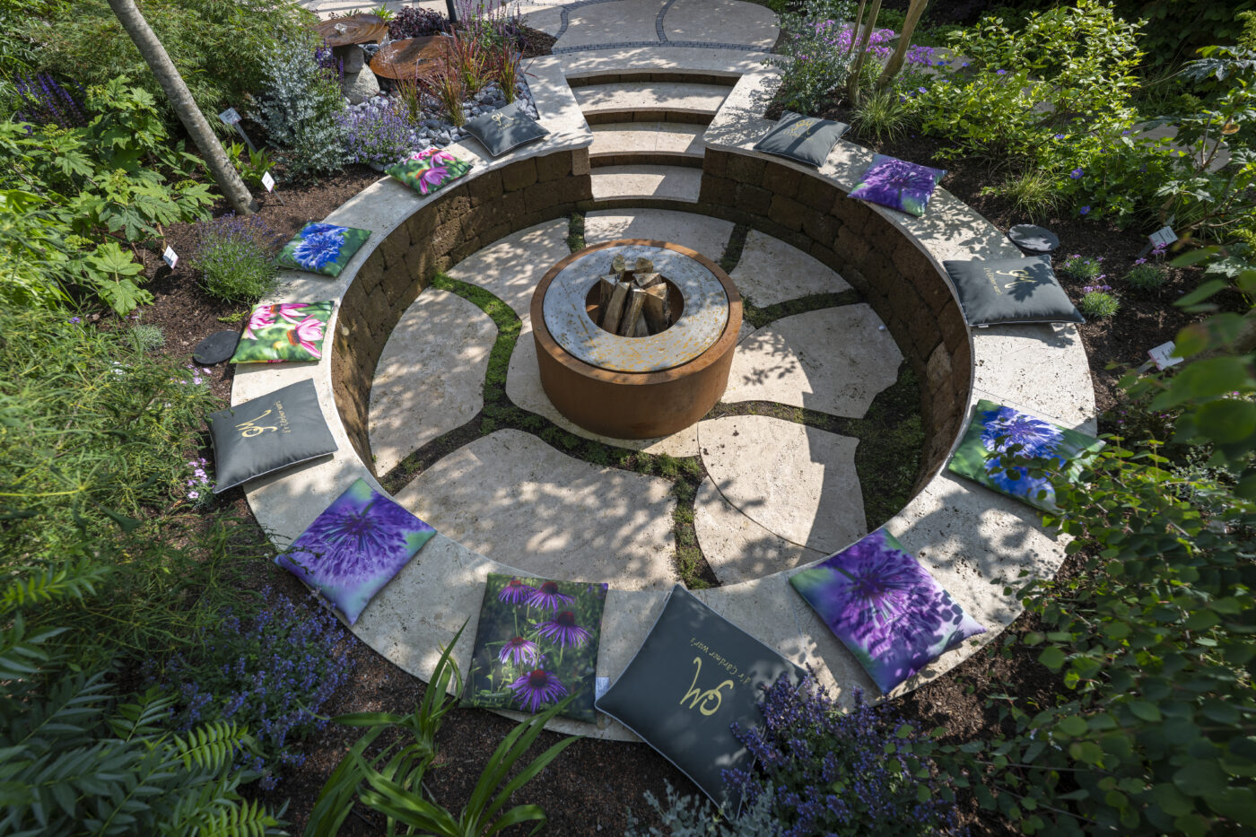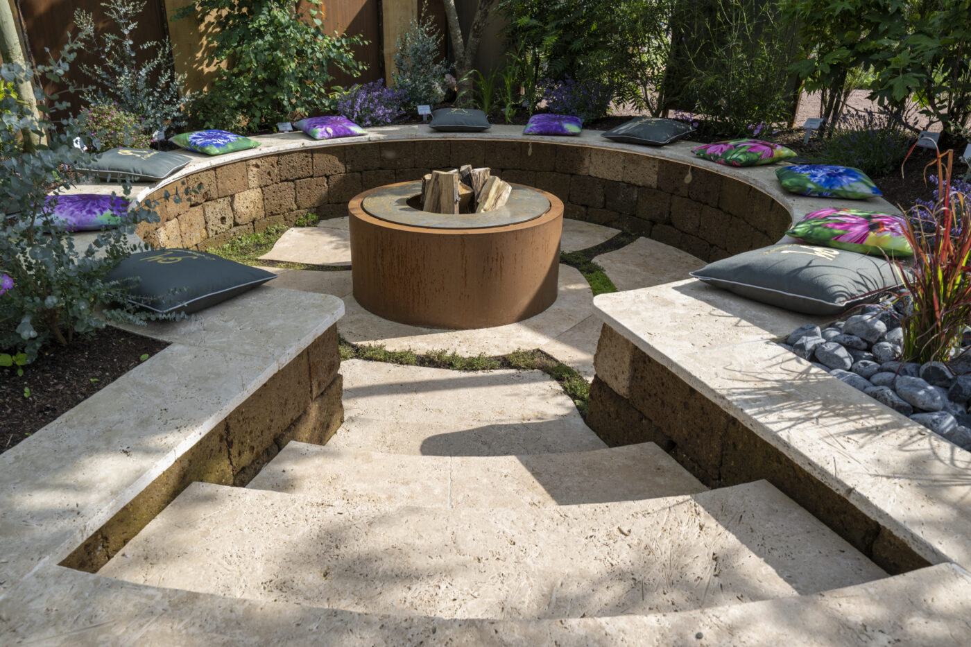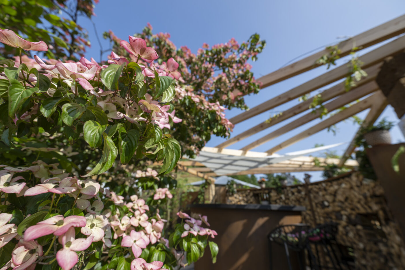 Bereits der Blick durch das beeindruckende Tor lässt die Schönheit und Ruhe dieses Ortes erahnen: Eine Oase, in der Platten aus Travertin den Weg ebnen und Teppichthymian die Schritte umschmeichelt. Der tieferliegende Grillplatz ist der Wohlfühlort für gesellige Abende. Tuffsteinmauern, Kleinsteinpflaster und duftende Kräuter vervollkommnen die Atmosphäre und unter der mit Hopfen berankten Pergola verspricht eine Bar entspannte Stunden.